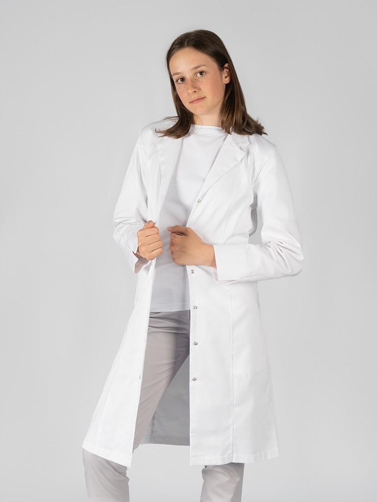 Ženska halja, ki navdušuje s svojim klasičnim videzom in teliranim krojem. Zapenjanje je na pritiskače. Halja ima klasičen ovratnik, dolge rokave ter dva našita žepa spredaj.
