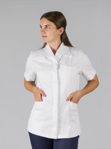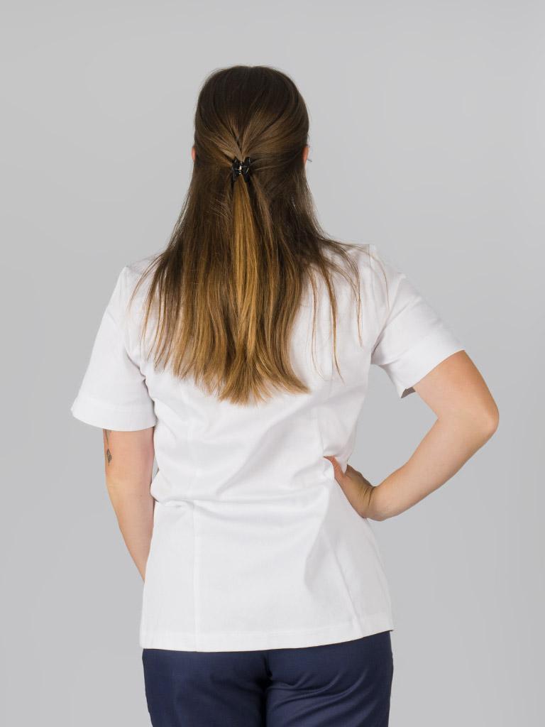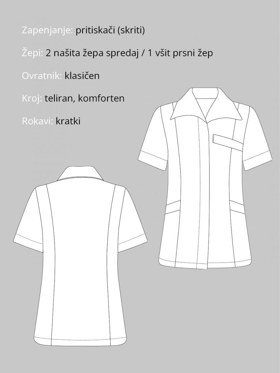Ženska tunika, ki navdušuje s klasičnim izgledom in teliranim krojem. Zapenjanje je na pritiskače, ki so skriti. Tunika ima koničast ovratnik, kratke rokave, dva našita žepa spredaj in všit prsni žep.
